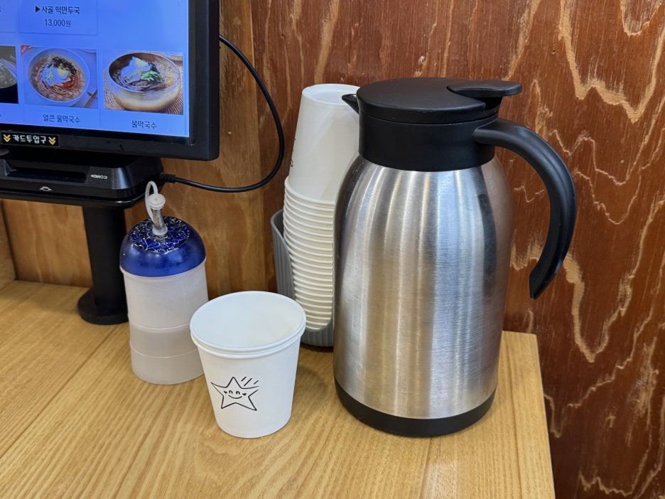 주문은 키오스크로 하게 되어있구요 저는 비빔막국수를 주문하고 부모님은 물막국수인데 따뜻하게 먹고싶다고 말씀드리니 사골국물에 국수를 내어주셨어요.