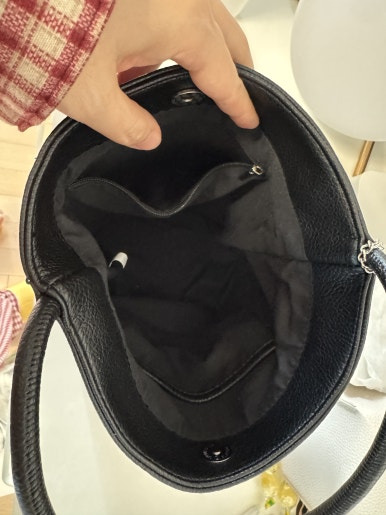 가방은 안쪽에 나일론 천이 안감으로 덧대어져있구요 좌우로 포켓이 하나씩 있습니다. 하나는 지퍼포켓, 하나는 그냥 오픈되어있는 포켓입니다. 오픈되어있는 포켓은 끝에 가죽 트리밍으로 보완이 되어있어서 은근 마감이 좋다는 생각이 들더라구요.